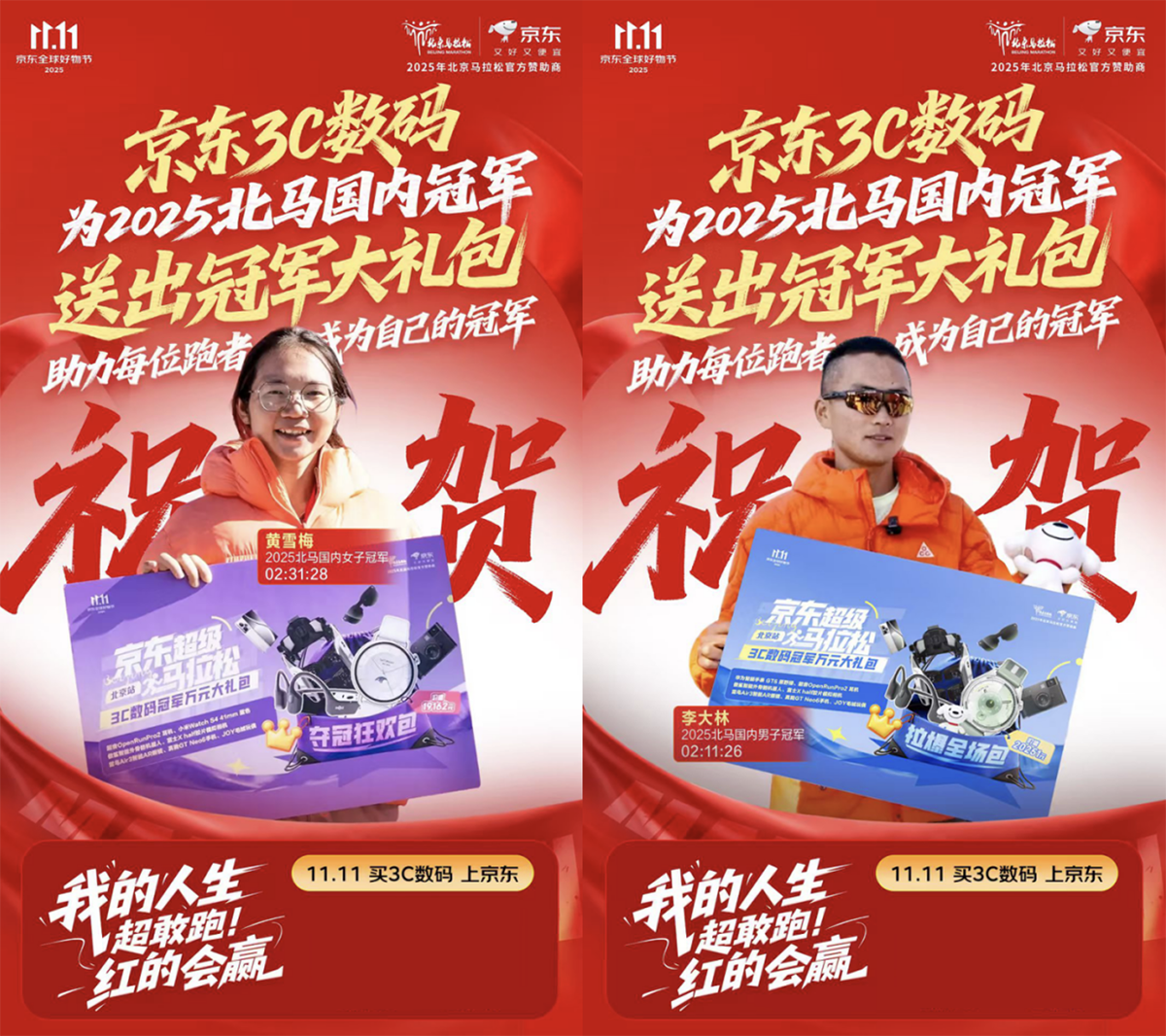 随着2025北京马拉松的圆满收官,赛事冠军正式揭晓——男子组冠军由李大林夺得,女子组冠军则由黄雪梅摘得桂冠。两位冠军不仅获得了由京东特别准备的“超级马拉松冠军大礼包”,还惊喜亮相京东3C数码采销直播间,与网友分享比赛过程与赛后心情,畅谈备赛心得与跑步体验。更令人期待的是,他们还亲自为观众抽取“冠军同款大礼包”,送出价值超万元的惊喜好礼,让冠军荣耀与赛事热度在终点之外持续延展。